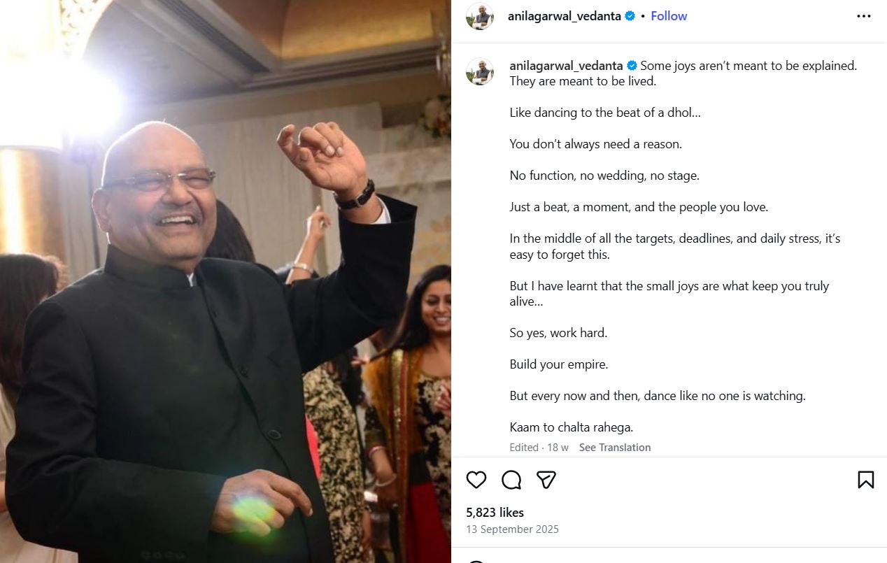 An Instagram post by Anil Agarwal, where he discusses how dancing helps with relaxation and stress relief