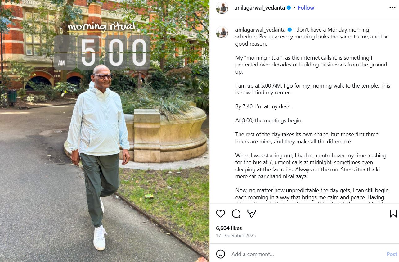 An Instagram post shared by Anil Agarwal, where he is talking about his morning routine