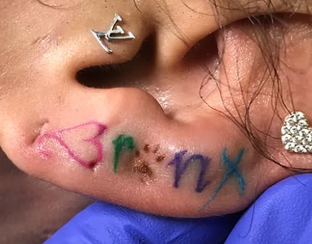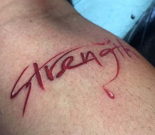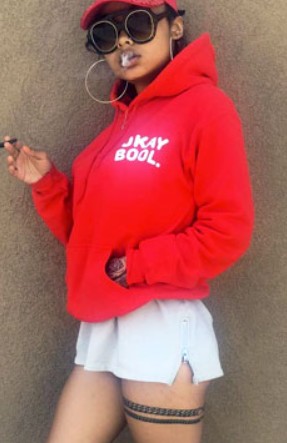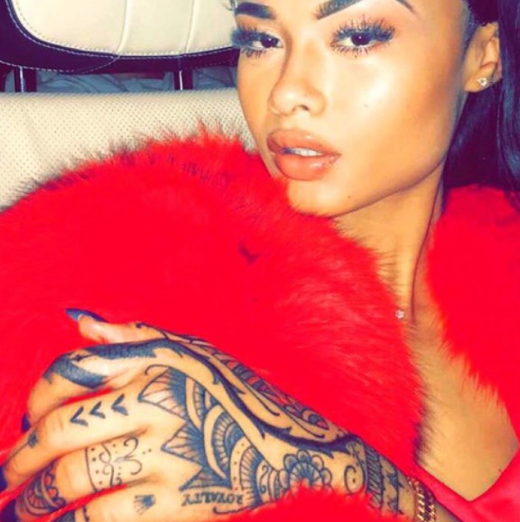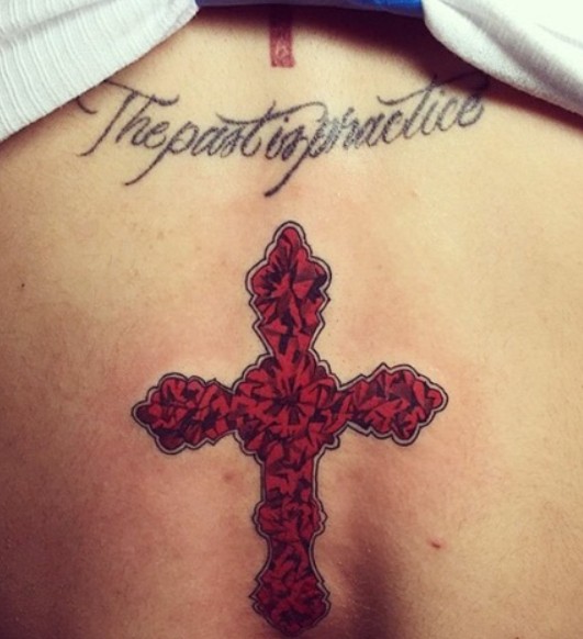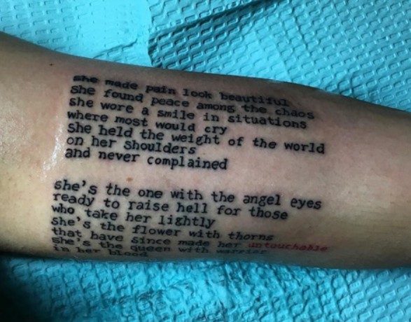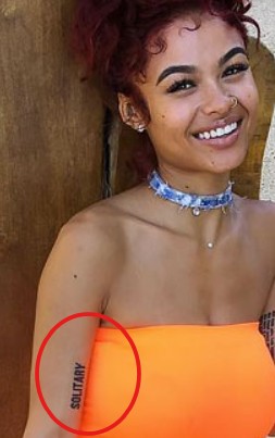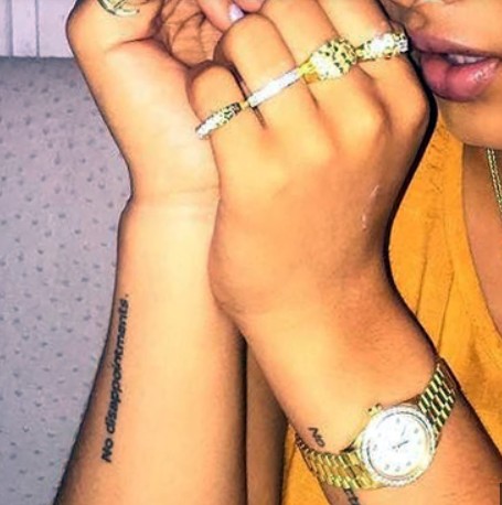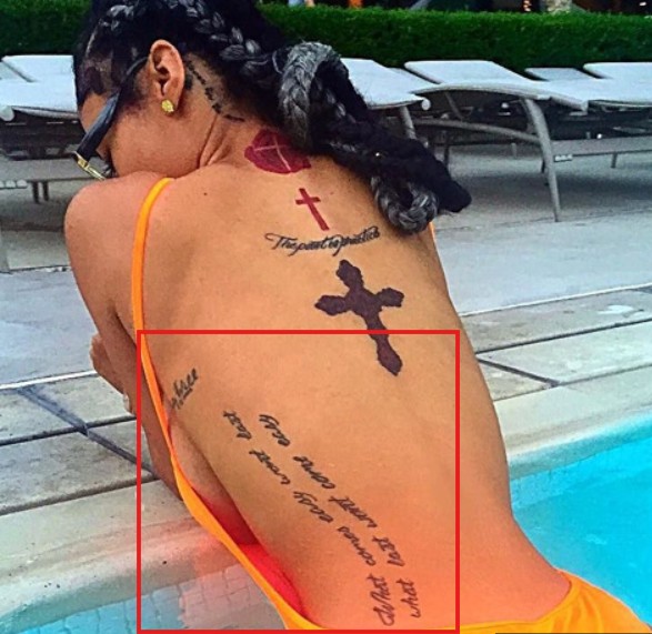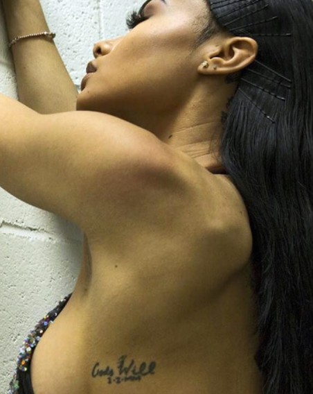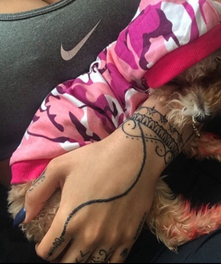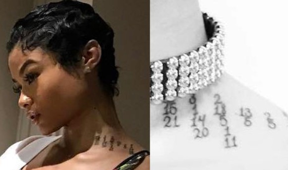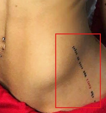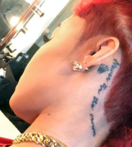 Tattoo(s) | • On the edge of her left ear- Her dog’s name 'Bronx' ![]() • On the left side of her ribcage- Silhouette of a prancing horse ![]() • On the back of her left leg- Ace of spades playing card ![]() • On the front of her left thigh- Two jewelry chains tattoo ![]() • On the left side of her collarbone- Six vertical lines of numbers which are cryptograms representing letters in the alphabet. The numbers 25, 15, 21; 3, 1, 14, 20; 2, 18, 5, 1, 11; 13, 5; 2, 5; 8, 1, 16, 16, 25 translate to 'You Can’t Break Me. Be Happy.' ![]() • On her right upper arm- 'Solitary' ![]() • On her right forearm- Woman blowing smoke out of her mouth ![]() • On the center of her chest- The fleur de lis ![]() • On her left hand- Tribal ancient Egyptian ![]() • On her left hand- Black tribal ink design ![]() • On her upper back- The past is practice ![]() • On her neck- A big red rose with an outline cross and a red cross tattoo with the number six in it ![]() • On her back- A big red cross as a tribute to her dead grandma, GrannyRuby ![]() • On her left bicep- “she made pain look beautiful she found peace among the chaos. she wore a smile in situations where most would cry she held the weight of the world on her shoulders and never complained. she’s the one with the angel eyes ready to raise hell for those who take her lightly she’s a flower with thorns that have since made her untouchable shes the queen with warrior in her blood” ![]() • Inside her left elbow- 'Strength' in bloody red ink ![]() • On the left side of her abdomen- 'Trust no one, the devil was once an angel' ![]() • On the right side of her butt- LA Team logo ![]() • On the back of her left ear- A crown with a saying ![]() • On her left hand- 'Royalty' ![]() • On her left ribs- 'God’s Will' with a date I-I-MM ![]() • On her left hand fingers- Tribal style tattoos ![]() • 'No expectations (on the left wrist) and no disappointments (on the right wrist) ![]() • On the left side of her back- 'What comes easy won’t last, what last won’t come easy' ![]() • On her right ribs- Hebrew writing tattoo followed by the number 46 ![]() |