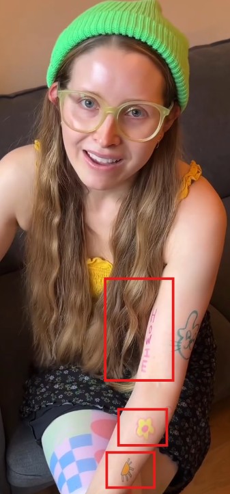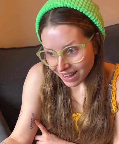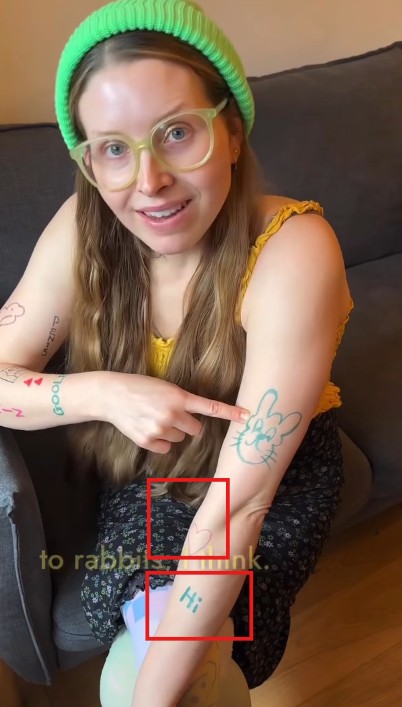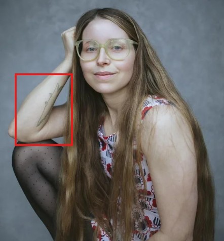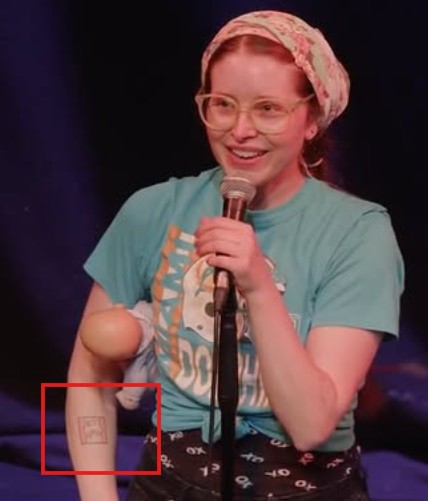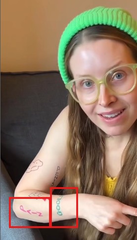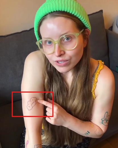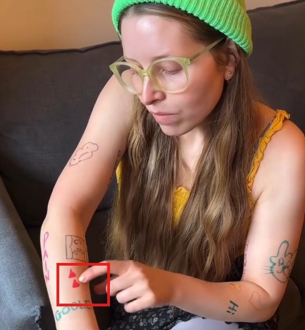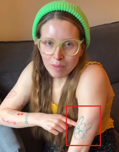Jessie Cave showing her Blood Drops tattoo on her left arm