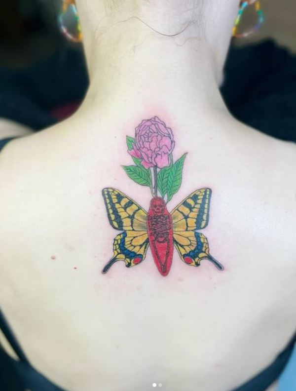 | Tattoo(s) | On the Left Shoulder: A flower![]() Near Her Right Collarbone: Two Stars ![]() On her Back: A butterfly with a flower on the top and a skeleton within ![]() |