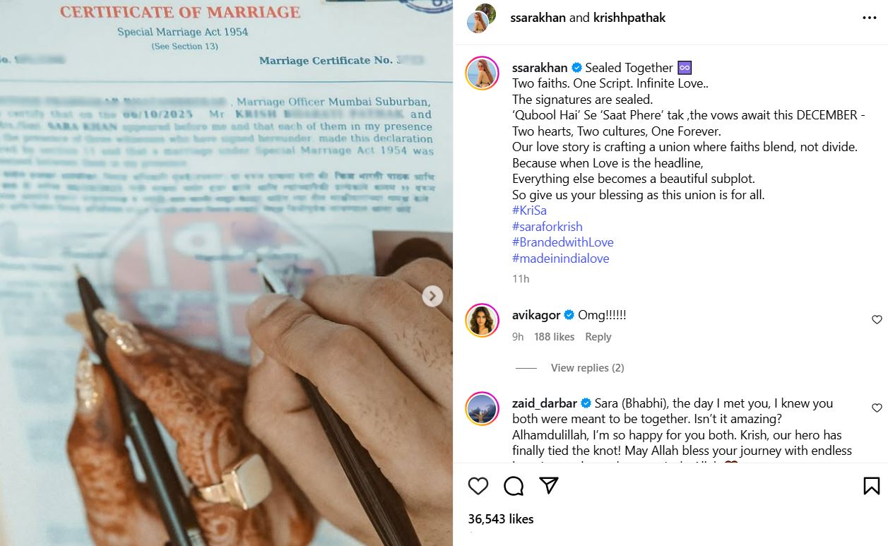 - Sara Khan married actor Krish Pathak on 6 October 2025 in a simple, private court ceremony. The couple had been dating for a year after meeting through a dating app.