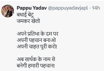 - Sarthak Ranjan was born in a political family of Bihar, as his father, Rajesh Ranjan aka Pappu Yadav, has been a member of parliament and founder of Jan Adhikaar Party (JAP). His mother, Ranjeet Ranjan, has also been a member of parliament (MP).