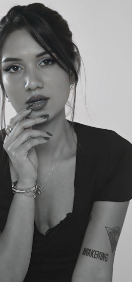 | Tattoo(s) | • On the right upper arm: Flowers ![]() • On the right arm above the elbow: A mountain ![]() • On the left upper arm above the elbow: Ocean with word AWAKENING ![]() • On the left side of the ribs: A sanskrit phrase ![]() • On the left shoulder: A boat ![]() |